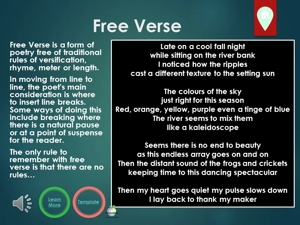 Feb 02, 2020 · in this post, we're going to offer a short introduction to the poetic form known as free verse, and introduce some of the debates surrounding the idea of 'free' verse what is a free verse poem. Free verse is a literary device that can be defined as poetry that is free from limitations of regular meter or rhythm, and does not rhyme with fixed forms.